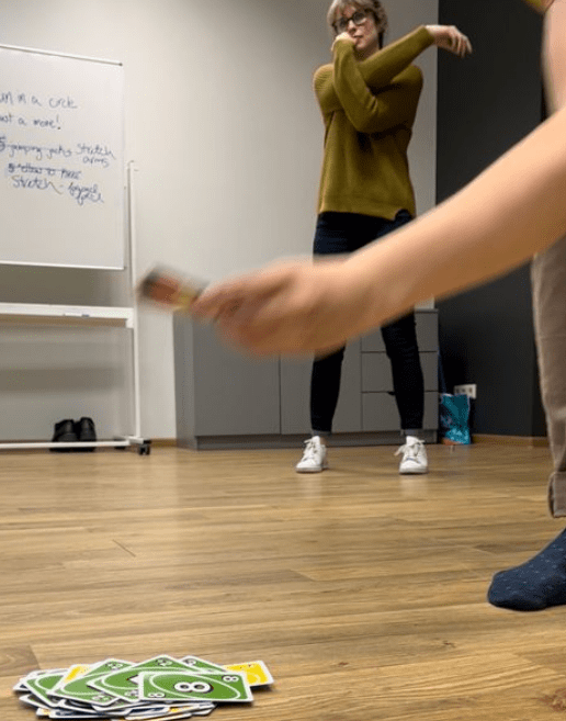 Once you have actions assigned to each card, play uno like you normally would. Everyone has to do the action associated with the card played. This keeps everyone up, moving and in the red zone.